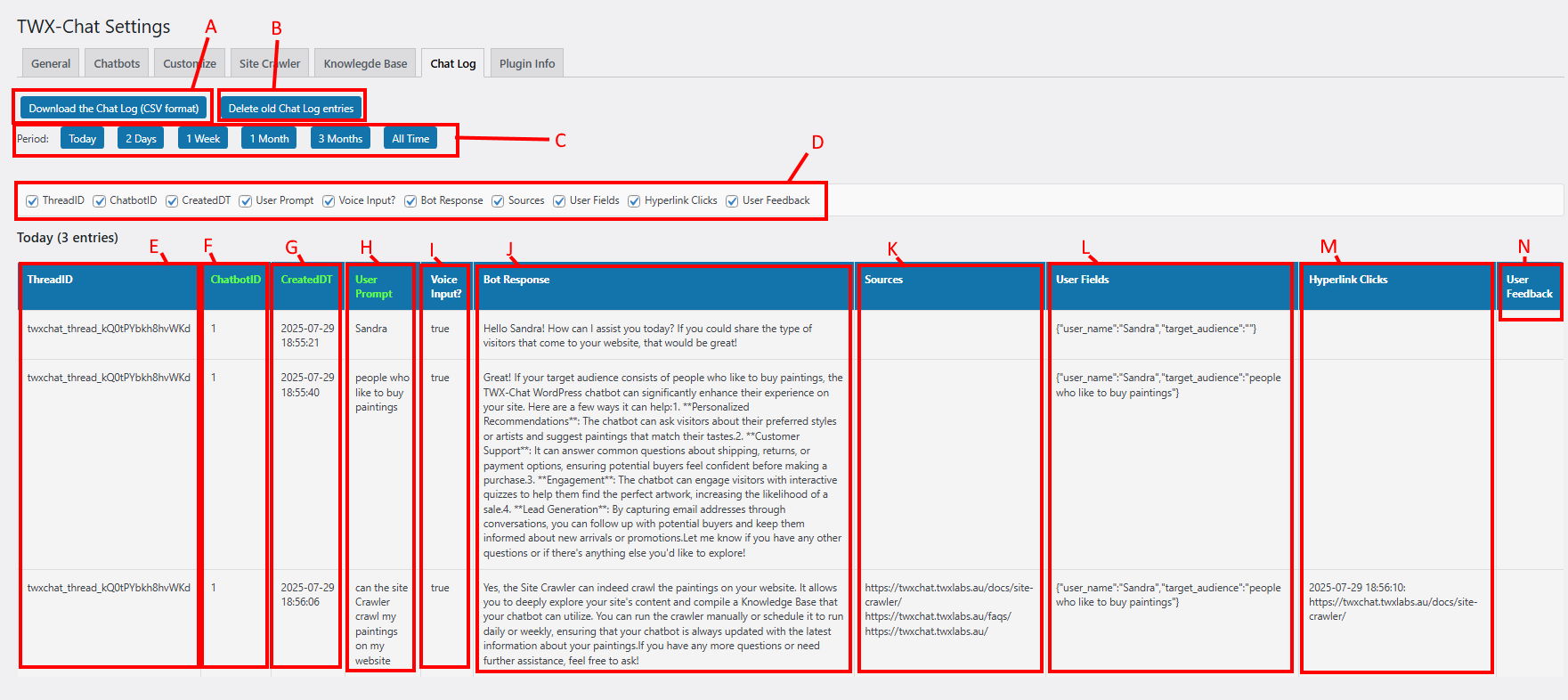 - A – Backup/Download the Chat Log to a CSV file for the selected Period