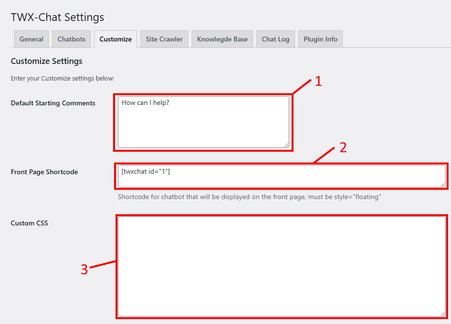 - 3 – Custom CSS: Enter custom styling here. It will only be used on pages that contain a TWX-Chat Chatbot.