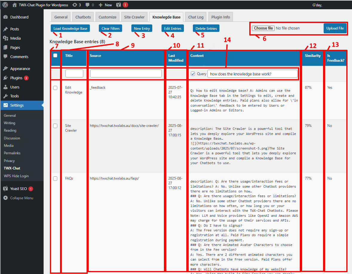 - 5 – Delete Entries button: Select one or more KB entries using the checkboxes on the left (#7) and this button will appear. Click this button to remove any unwanted KB entries. You will be asked to confirm this action.